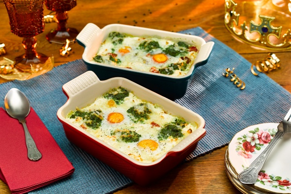 Add pops of colour to your spread with this cheesy baked eggs, wilted spinach and cherry tomato recipe…