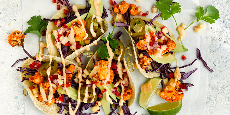 We added jalapeños and mango to our Caribbean cauliflower tacos, the perfect sweet and spicy combination for that added world foods twist.