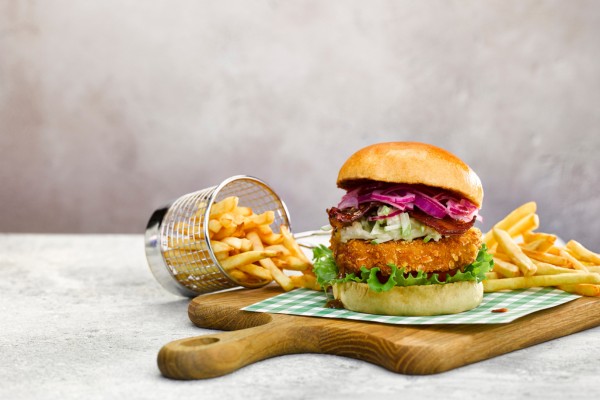 A menu staple and classic go to for many consumers is the burger, and this Louisiana-style chick’n burger is the perfect meat free burger solution! This burger starts with a juicy, tender chick’n patty, coated in a crunchy cornbread crumb and Louisiana spices, topped with vegan bacon, cabbage and apple slaw, drizzled in a hot chilli maple syrup!