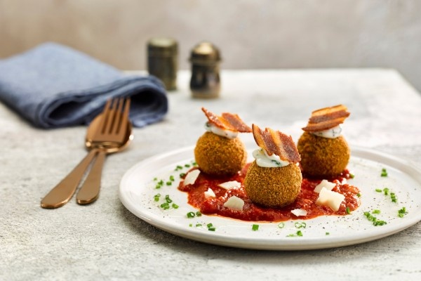 Second, a mushroom and blue cheese Arancini! A delectable dish that combines crispy, golden-fried risotto balls with a flavourful filling of earthy mushrooms and a creamy blue cheese! To elevate the dish further, we placed the Arancini on top of a rich tomato sauce, then finish with a truffle oil mayonnaise and a crispy vegan bacon snap!