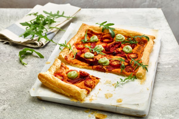 Finally, a pesto and roasted vegetable open tartlet. This tartlet consists of a flaky and buttery puff pastry sheet that serves as the foundation for a tomato sauce base, roasted red peppers, sundried tomatoes and a green pesto and vegan cream cheese swirls.