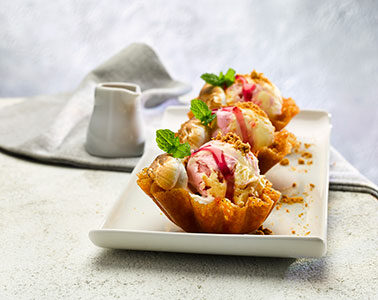 - Scoop ice cream into the brandy snap and top with mallow, sauce, fresh raspberries, mint and Biscoff crumb.
