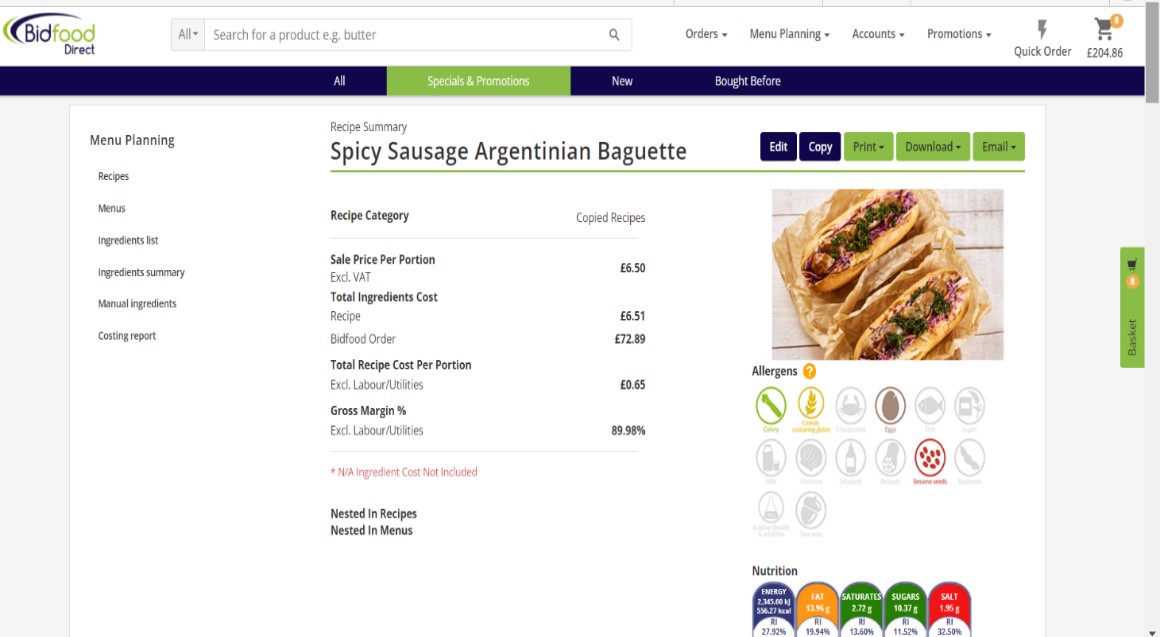 MyRecipes and Menu Planning can be accessed via Bidfood’s online shop, Bidfood Direct. The tools allow customers to create their recipes and menus based on their agreed product range and pricing. One of the benefits of these tools is their clarity, offering clear and easy to understand allergy icons, nutritional data and front-of-pack nutrition traffic light labelling information, which can be used to create a label for your pre-packaged recipes.