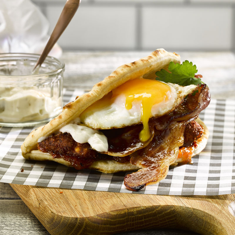Bacon, egg, pakoras and chutney, this recipe is ready in 10 minutes and provides that world foods flare to any breakfast menu.