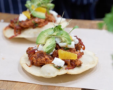 Time for tostada’s! These deliciously crisp vegan chicken tostadas combine the perfect fusion of herbs, spices and textures, that unites together in one unique dish. The smoky chipotle paste, with orange segments, crumbled feta set your taste buds off and the chicken style fillets, adds that meat like texture to make it feel full bodied! – Brilliant!