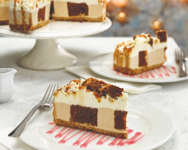 This cake is an absolutely amazing festive treat, perfect for dessert menus, cafes and coffee shops! It delivers on both flavour and texture and really will get the attention of your customers. The combination of salted caramel drizzle, caramel cheesecake and pieces of gingerbread cake, all on a biscuit base is just delicious. What’s more, we’re donating £1 per cake sold to FareShare via Work for Good, making it all the more sweet.