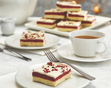 Taking inspiration from the hugely popular millionaires flavour combo, this new festive raspberry millionaires slice is a perfect sweet treat for any café or coffee shop. The bright red raspberry caramel layer will no doubt stand out on your display and it is topped with a layer of delicious white chocolate and freeze dried raspberry pieces. Cobbs is a recognised brand famed for making delicious sweet treats in Inverness, Scotland, so we know this cake is delicious!