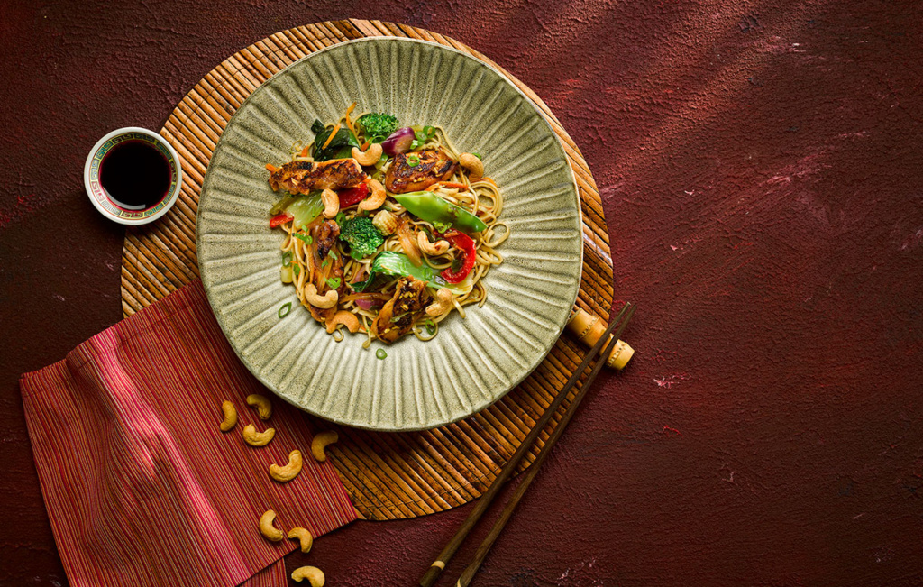 - Add the vegetables and noodles. Turn the heat up high to finish cooking and add sliced spring onions and toasted cashews ready to serve.