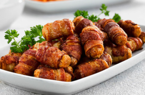 100 gluten free pork chipolatas wrapped in smoked streaky bacon.