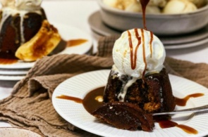 Sticky toffee pudding with caramelised banana skin and Yarde Farm popcorn ice-cream