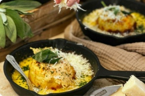 An indulgent starter creatively made with the would-be-wasted bits of cheese, double-baked into a decadent soufflé.