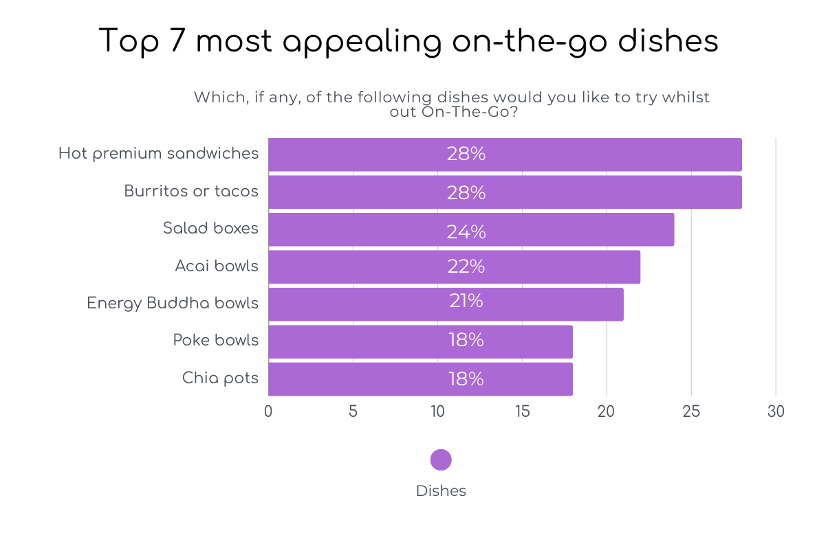 There is a high demand for consumers wanting to eat on the go, as over 40% of consumers are already eating on-the-go dishes such as wraps and cakes when out. There is a particular interest in high quality on-the-go food such as hot premium sandwiches and demand to try is considerable for the likes of diverse options including Buddha/Poke bowls and acai bowls which has growing appeal.