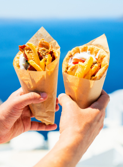 Gyros – shredded meat served in a pitta wrap with tzaziki, tomatoes, halloumi, calamari or octopus