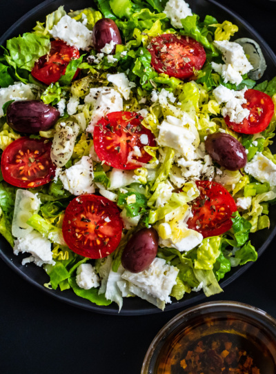 Horiatiki salad – made with tomatoes, onion, olives, peppers, feta, red wine vinegar