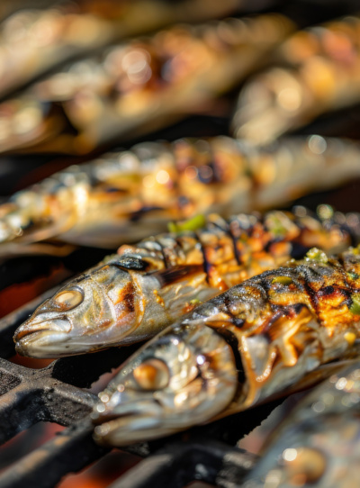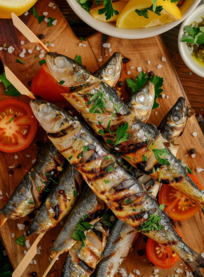 Grilled or barbecued sardines – often salted and cooked with garlic and a generous squeeze of lemon juice, usually served with bread