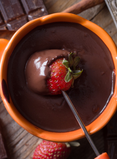Chocolate fondues are often eaten with berries, like strawberries, blackberries, raspberries, or other fruit, for example apple, cherries, bananas, grapes, pineapple and kiwi, marshmallows and small biscuits or chopped waffles.
