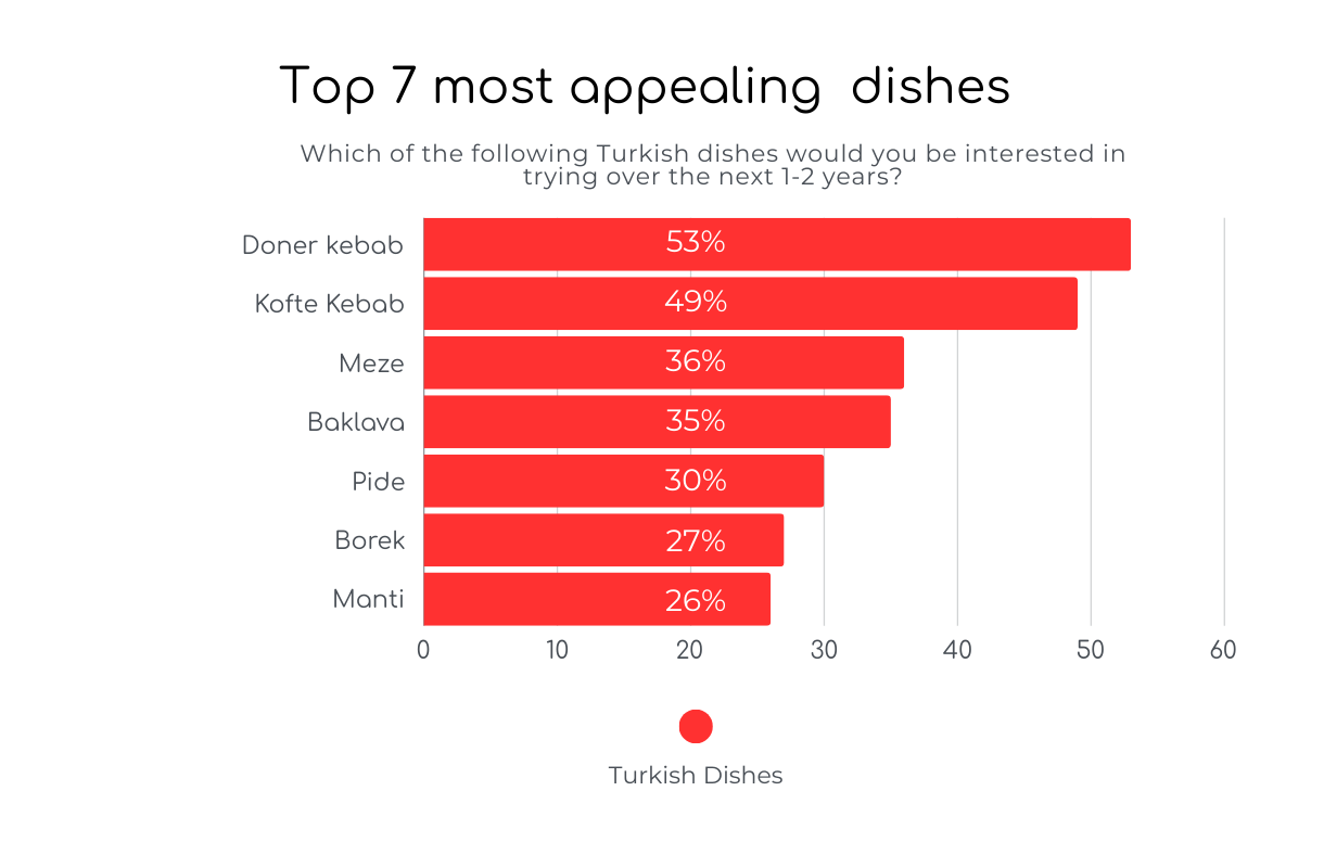 The Turkish food that you should include on your menu in 2025 are a selection of kebabs, particularly Doner Kebab and Kofta Kebab, as they have the greatest appeal. You should also include a selection of sharing dishes on your menu such as Meze or a Pide pizza. These are all considered the most popular dishes consumers would be interested in trying within the next 1-2 years.