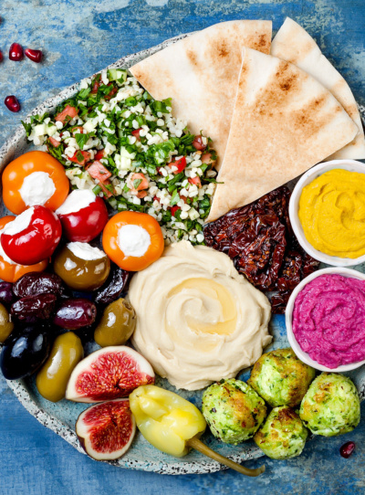 Breads and dips like taramasalata, tzaziki, or hummus