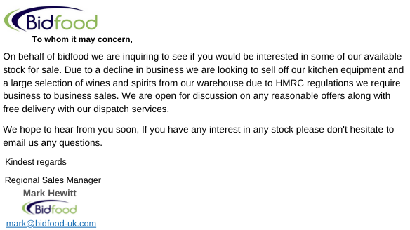 We have been made aware of recent instances of a group of fraudsters targeting hospitality businesses, including Bidfood customers, via an e-mail scam to solicit payments. Emails may looks like the example below and may have been sent from fake “look-alike” email addresses for example, mark@bidfood-uk.com or mark@bidfood-uk.co.uk (a genuine email address will always end in @bidfood.co.uk). It may even include a mobile number manned by the team behind the fraud. Names we are currently aware have been used include Mark Hewitt, Ross Jones, Jamie Green and Tom Jones.