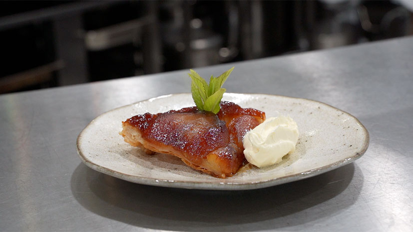 - Arrange your apple quarters on top of the caramel sauce (please be careful as this will be extremely hot) in a tightly packed circle around the edge of the dish first, rounded-side down, then fill in the middle. Gently press with your hands to ensure there are no gaps. Brush the fruit with the remaining melted butter.