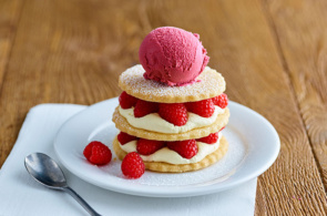 - Allow to cool to room temperature for 1 hour before running a knife around the edge of the dish and inverting it onto a large serving plate that is deep enough to contain the juices. Serve with clotted cream or vanilla ice cream.