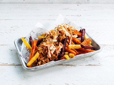 - Place the tricolore vegetable fries in a large bowl. Arrange the pulled jackfruit over it and finish with the coleslaw and crispy onions.