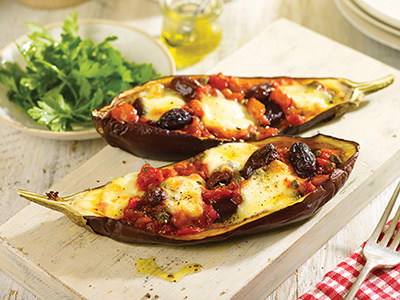- Divide the filling between each of the four aubergines and lay the mozzarella cheese over the top. Place back in the oven for 10 minutes until the cheese has melted. Drizzle with extra virgin olive oil and serve with a salad.