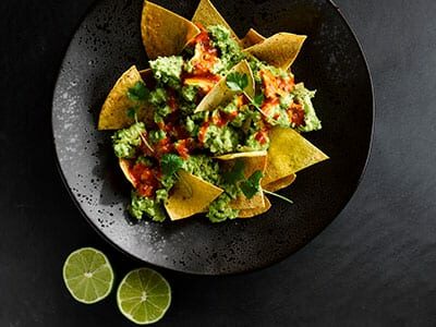 - Place the smashed avocado on top of the toasted corn tortilla chips and drizzle with adobo sauce and a squeeze of lime juice.