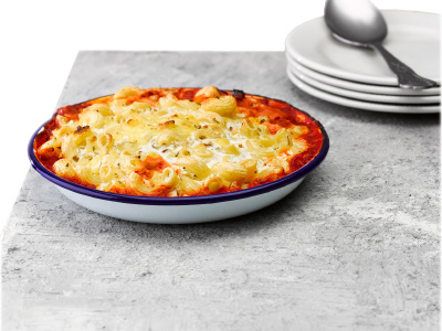 - Place the gustoso sauce in the bottom of the pie tin and top with the pasta mix.