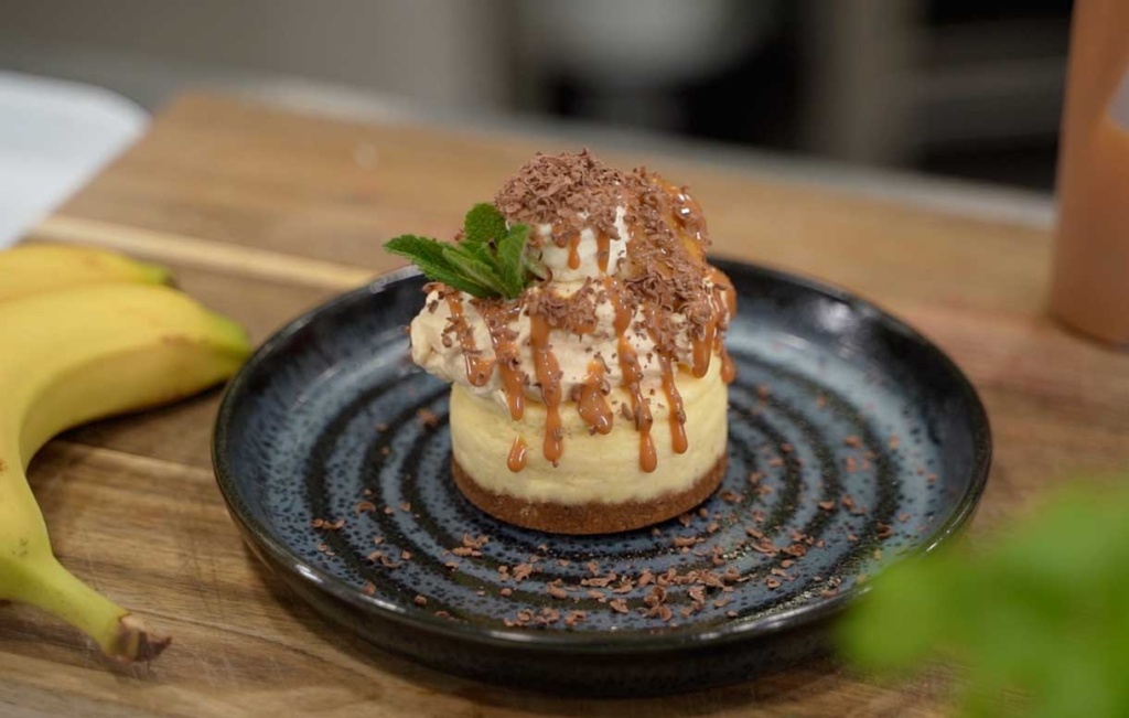 - Top the cheesecake with the mix and then finish with warmed caramel sauce, mint and grated chocolate.