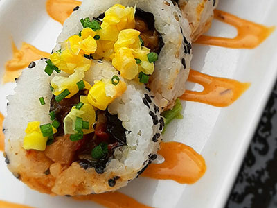 - Whilst the rolls are chilling, prepare the garnish by chopping the avocado into a small dice and mix with the chopped sweetcorn. Add the lemon juice and the chopped chives and mix well.