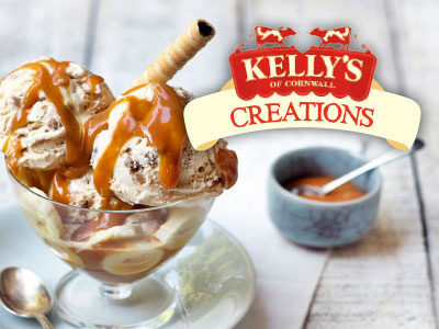 - Place 2-3 large scoops of Kelly’s Millionaires Shortbread ice cream into a glass.