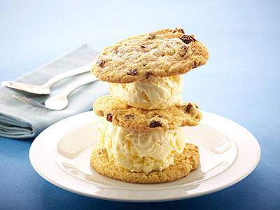 - To serve, stack up with three cookies and two scoops of ice cream, then dust the top cookie with a little icing sugar.