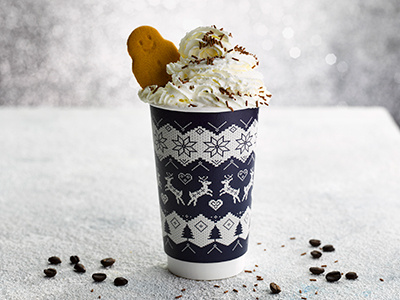 - Garnish with the whipped cream on top, a sprinkling of ginger or chocolate if the customer wishes and a mini gingerbread man.