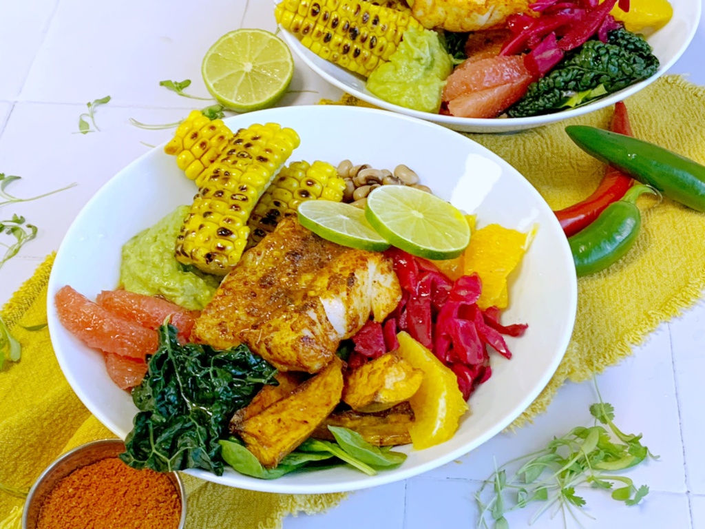 - To plate, in your chosen bowl, place all ingredients in sections, finish with the fish as the centre piece and drizzle with the dressing