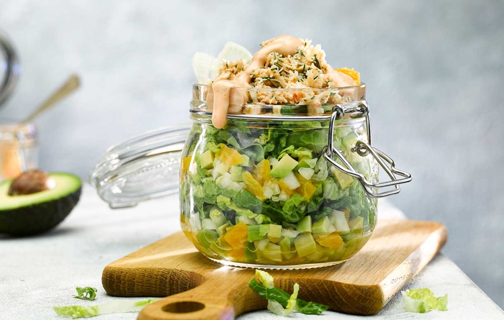 - Assemble your salad with layers of lettuce, fennel salad mix and crab throughout.