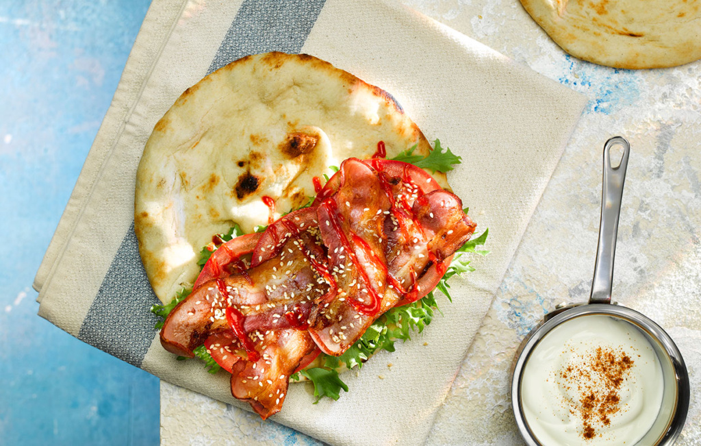 - Slice the tomato and place the flat bread onto a plate. Place the bacon, lettuce and tomato on top and drizzle on mayonnaise. Fold up the ends and roll length ways in to a cigar shape, cut on an angle, garnish with a drizzle of sriracha and yoghurt, for extra texture sprinkle with toasted seeds.