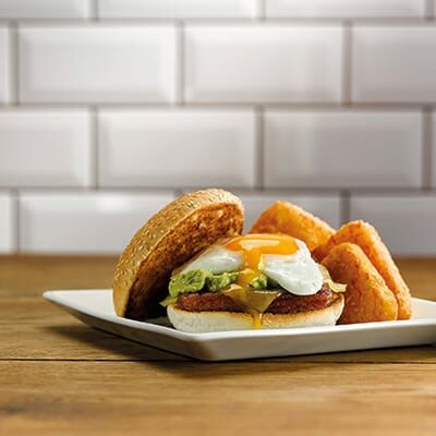 - Build as follows - base of bun, lorne sausage, Emmental cheese slice, fried egg, guacamole, toasted burger top.
