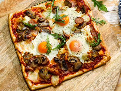 - Crack three eggs onto the pizza and cook for another 5-7 minutes or until the white is cooked and the yolk is still runny.