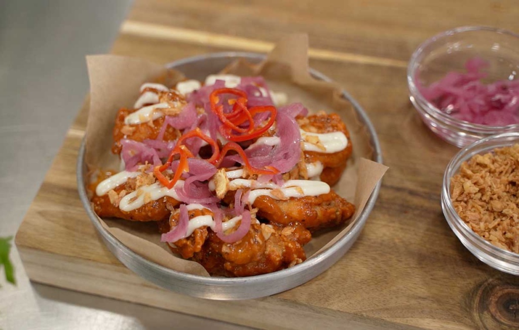 - Tumble with the buffalo sauce then top with blue cheese sauce, crispy fried onions, sliced pickled pink onions and red chilli.