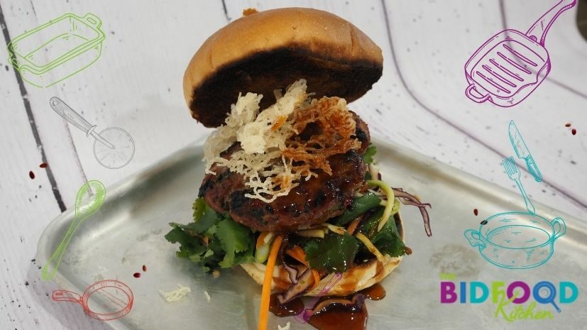- Toast the bun and layer the components - Finish with lots of fresh herbs like coriander or mint and a mopping sauce to finish.