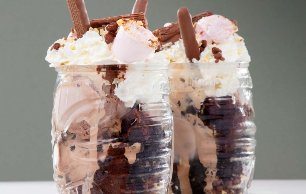 - Layer up the sundae glass, chocolate fudge cakes, crunchie bites, flake pieces, chocolate ice cream, whipped cream, toasted marshmallow, flake and Cadbury chocolate