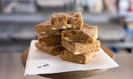 - While the blondie is still hot from the oven, sprinkle over the remaining cinnamon sugar