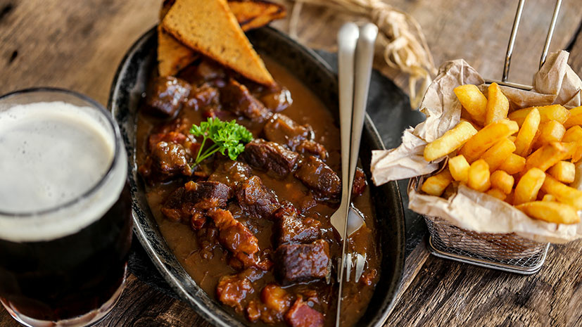 - Add the flour and continue to cook out then add the mustard, beef stock, beer and the beef back into the pan.