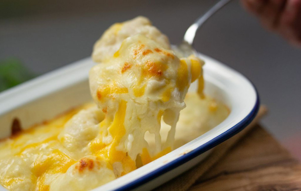 - Add half of the cauliflower to the baking dish. Pour half of the remaining cream over the cauliflower. Sprinkle a quarter of the remaining Everyday Favourites grated Cheddar cheese on top. Season with half of the salt and half of the black pepper.