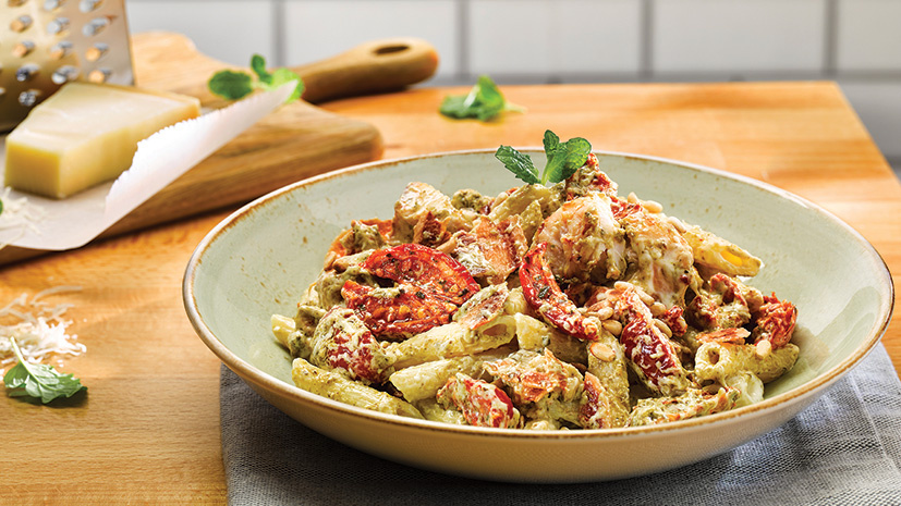 - Add the chicken, bacon and sun dried tomatoes to the bowl or pan and heat through