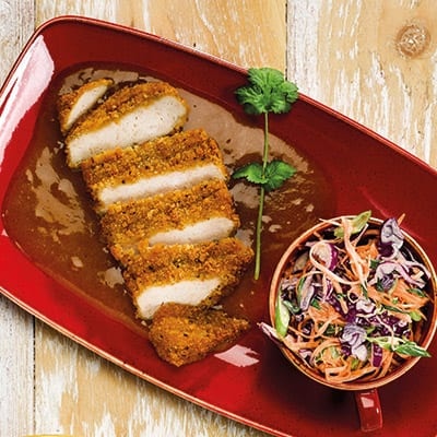 - Once chicken is cooked slice and place on top of the slaw and then serve with the katsu sauce