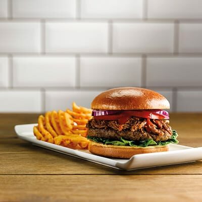 - Build the burger - bun base, cos lettuce, burger, chilli beef, tomato, hot sauce, red onion, toasted burger top.