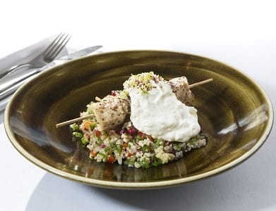 - Place the bulgur wheat salad onto a serving plate and arrange the chicken skewer on top.