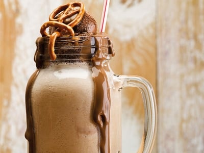 - Pour your milkshake into the kilner jar then top with the 4th scoop and drizzle over the melted chocolate.